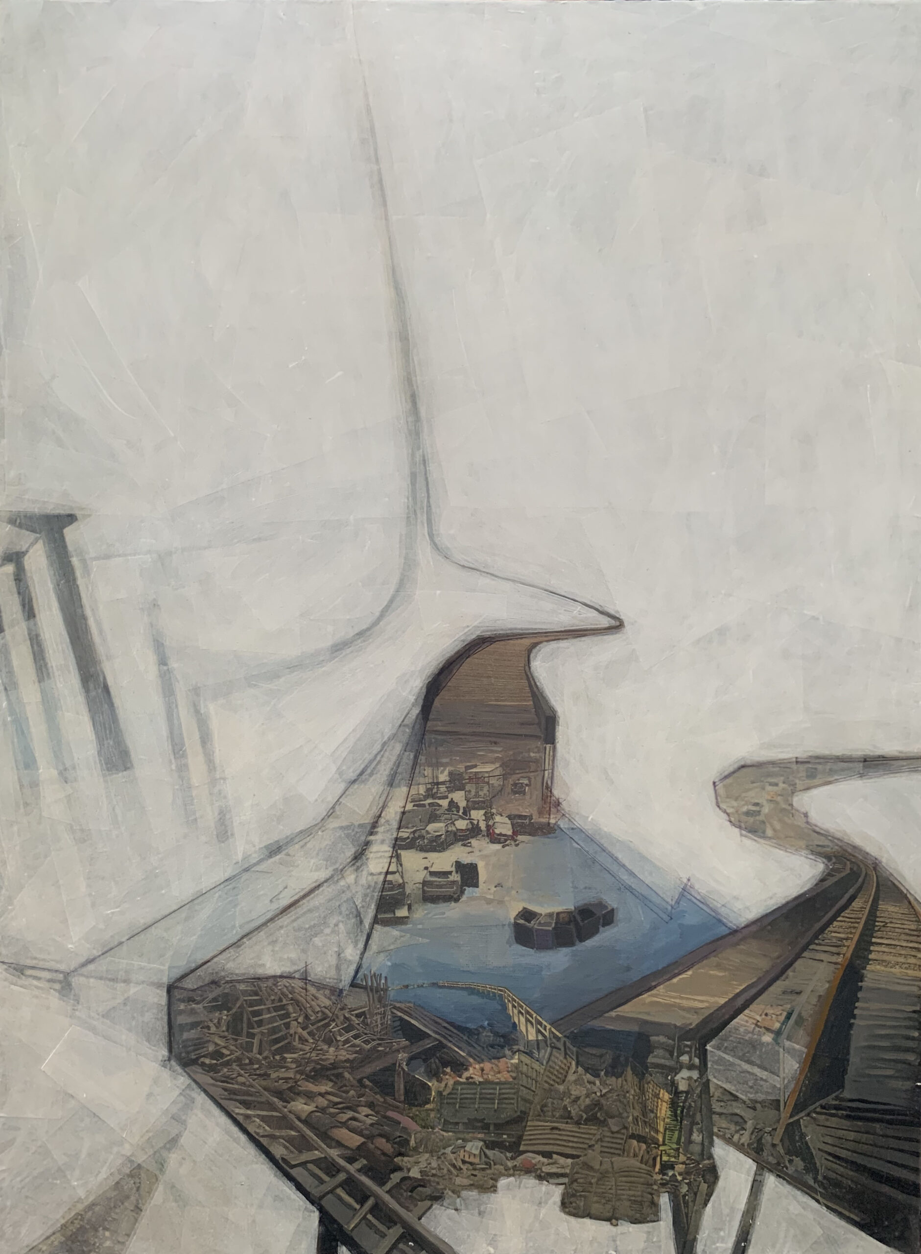18″x24″ Mixed media collage- acrylic, vellum, newspaper, magazines on canvas