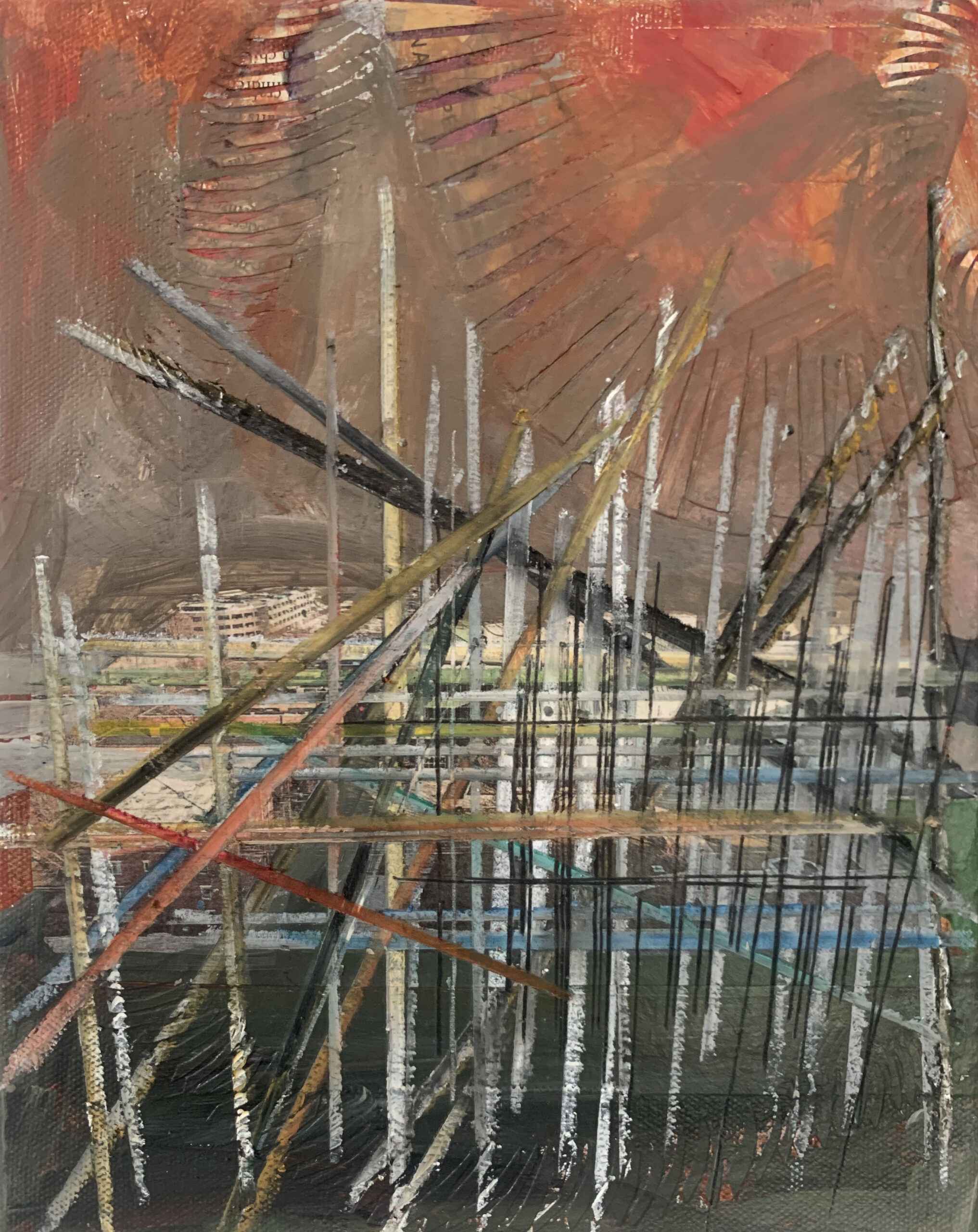 8″x10″ Mixed media collage- acrylic, newspaper, oil pastel, found objects on canvas